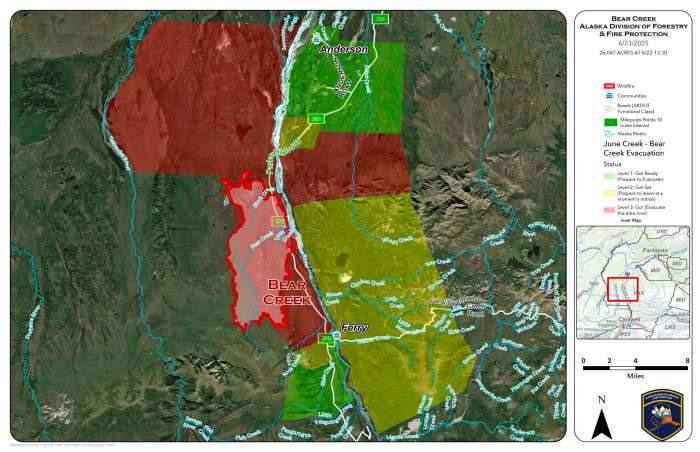 Level 1 “READY, 2 “SET” and 3 “GO!” are all in effect for this fire. Please visit http://www.facebook.com/denali.borough for the most current evacuation levels.