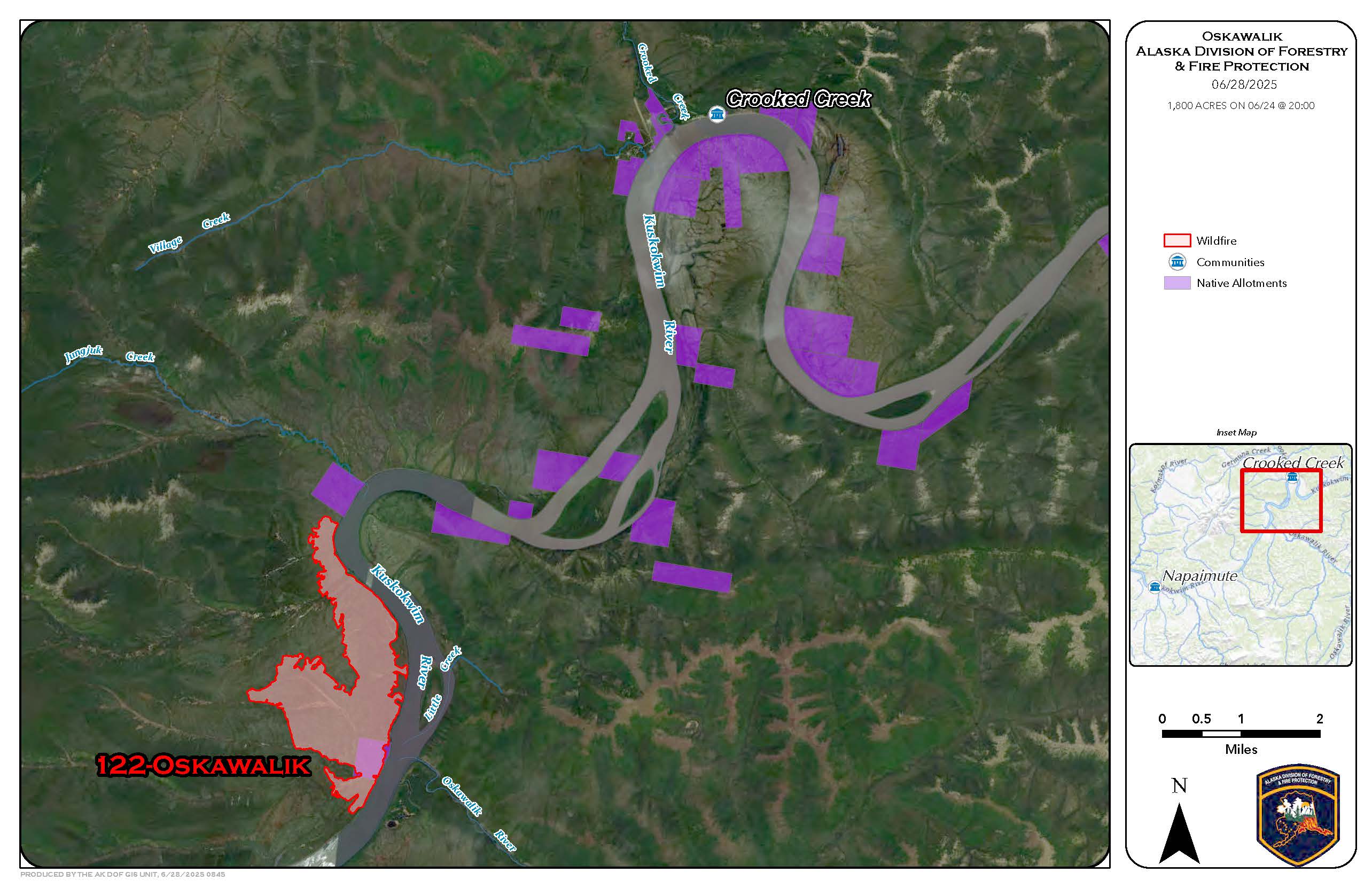 Firefighting assets will continue to be visible near the fire area and the community of Crooked Creek as aviation supports the firefighting operations and boats continue to use the Kuskokwim River to transport firefighters along the eastern perimeter for mop up and gridding.