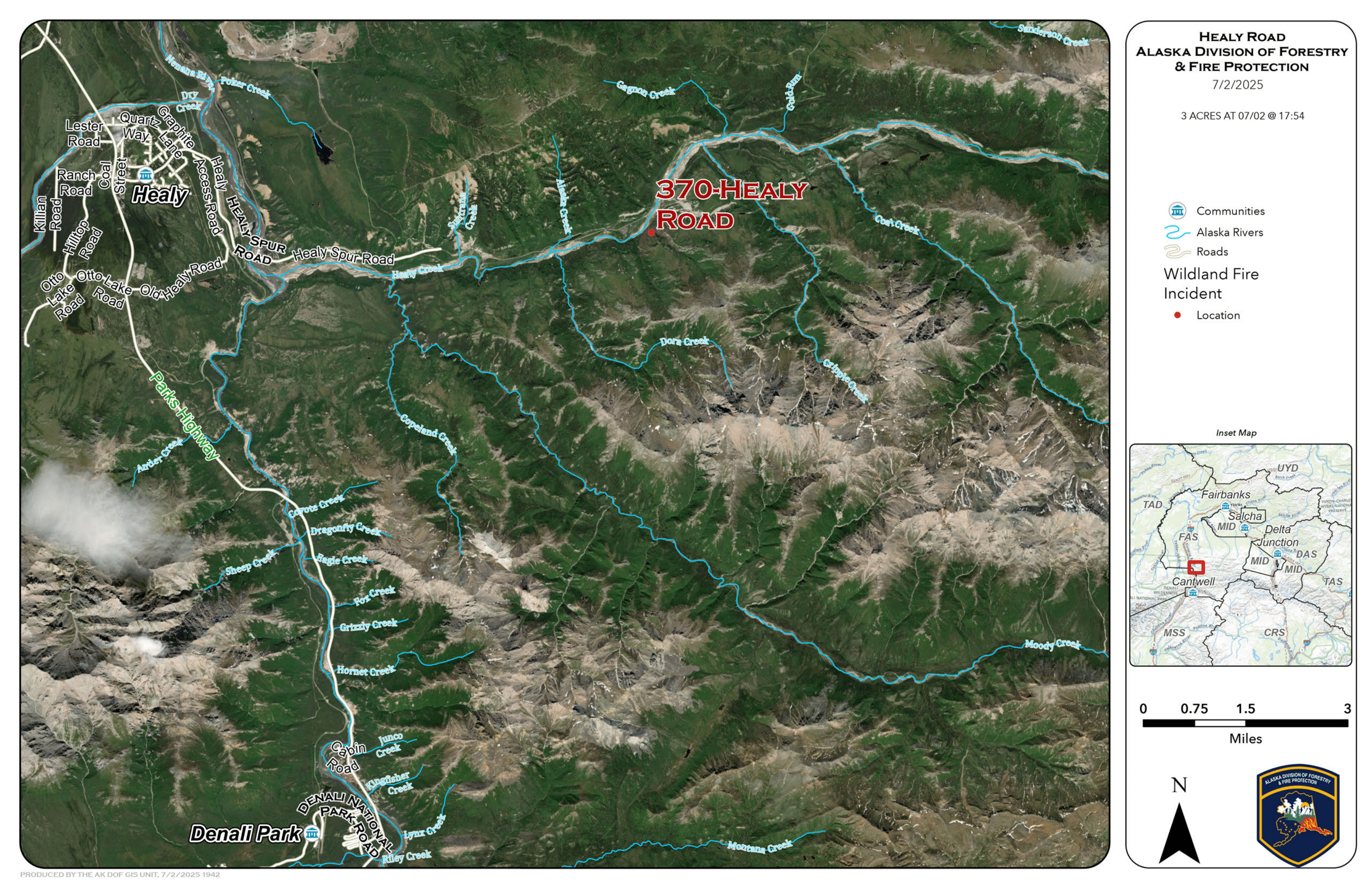 7:00 PM – Healy Road Fire (#370) was spotted Wednesday afternoon eight miles east of Healy along the south bank of Healy Creek, burning in tundra. Resources from the Bear Creek Fire (#237) are responding to the fire. Initial size up estimates the fire to be four acres.