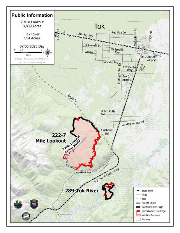 Activities – Containment efforts continue to make steady progress, with fire containment now at 83%. More containment line is expected to be added today as operations remain on track. Crews will continue mop-up, hot-spotting, and gridding operations in the boggy terrain on both sides of the river. So far, crews have gridded 50 feet into the fire’s interior and have established a saw line near the perimeter. Today, they plan to extend gridding up to 100 feet inward. Overall, the Tok River Fire remains on a positive trajectory.