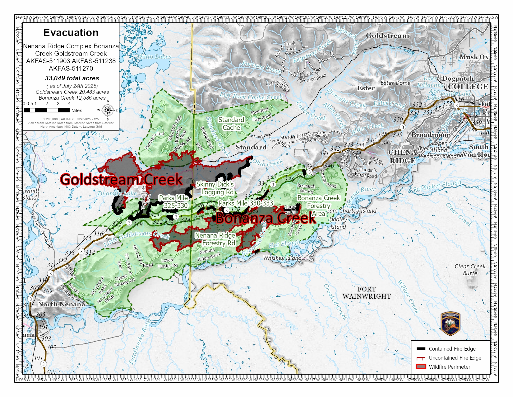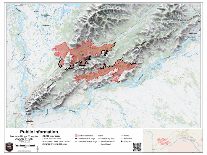 Evacuation Information: Forest roads in the Nenana Ridge Complex have restricted access. Only fire personnel will be allowed access to these areas due to ongoing fire activities. The following roads and any connecting roads fall under this road restriction; Nenana Ridge Road, Bonanza Creek Road, Maisch Logging Road and the Skinny Dick’s logging roads.