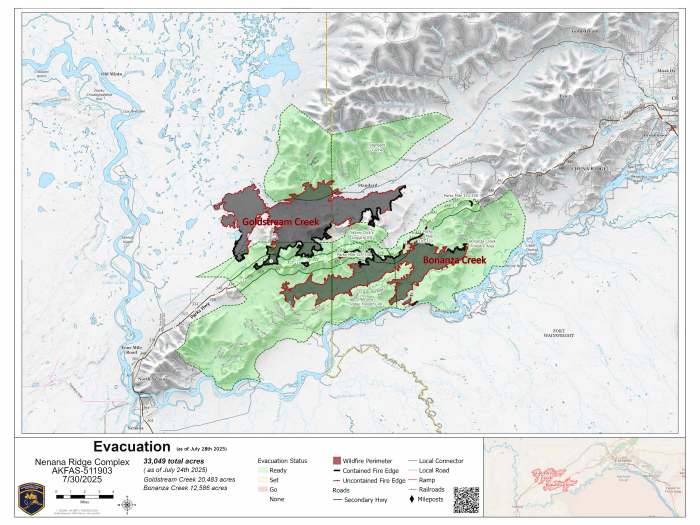 Evacuation Information: All evacuation levels were downgraded Monday, July 28th by the Fairbanks North Star Borough and the Alaska Division of Homeland Security and Emergency Management for the Nenana Ridge Complex.