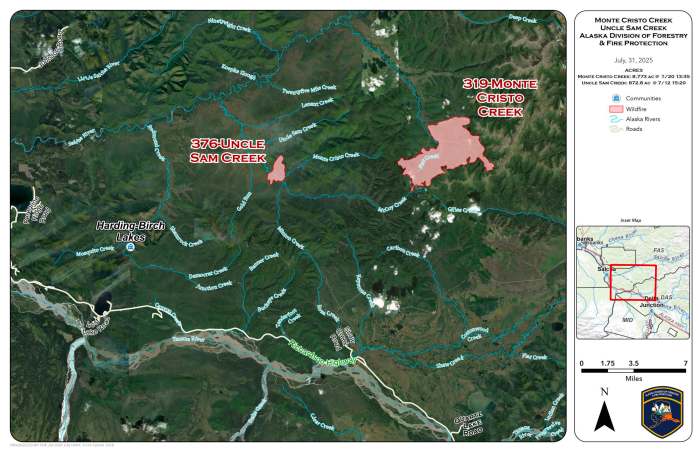 The Uncle Sam Creek Fire (#376) is currently 873 acres and is located about 19 miles east of Salcha, between Uncle Sam and McCoy creeks. This lightning-caused fire first discovered on July 3 and was initially responded to with helitack crews, scooper planes, and helicopters. The fire had been burning into burn scars from the 2023 McCoy Creek Fire. Due to a lack of an immediate threat to infrastructure and higher-priority fires in the region, it was previously unstaffed.