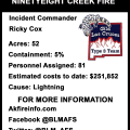 Rain and mild temperatures aided firefighters Sunday afternoon and evening in their efforts to suppress the 52-acre Ninetyeight Creek Fire (#391). Personnel are focused on minimizing the fire’s growth and spread by keeping its footprint to the smallest reasonable size… Read More ›
